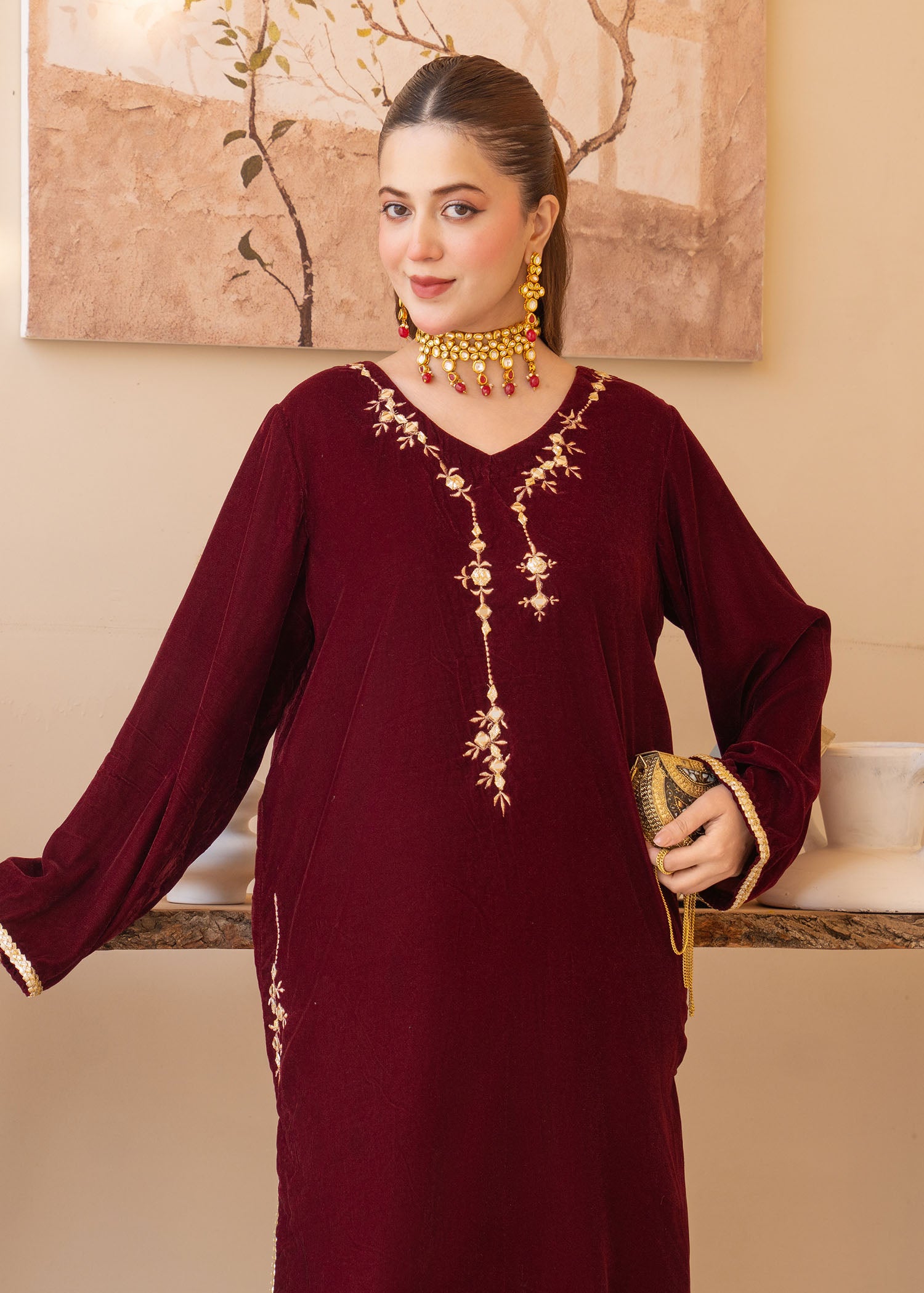 This luxurious velvet set features a shirt adorned with intricate sheesha and puff embroidery, paired with a matching velvet trouser for a cohesive and elegant look. The rich maroon color adds warmth and sophistication, making it perfect for formal events and festive occasions.
